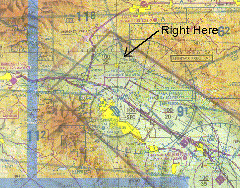 The point of this article happened on the return trip. Pause for a second, put down this newsletter, and go get your Los Angeles Sectional. It's okay, I'll wait. .........Doh dee oh doh doh ........................ Oh, you're back! Turn to the south side and locate the coordinates N33/ 59' W116/ 28.5'. You should be just north of Palm Springs. This is where we were when the event happened.